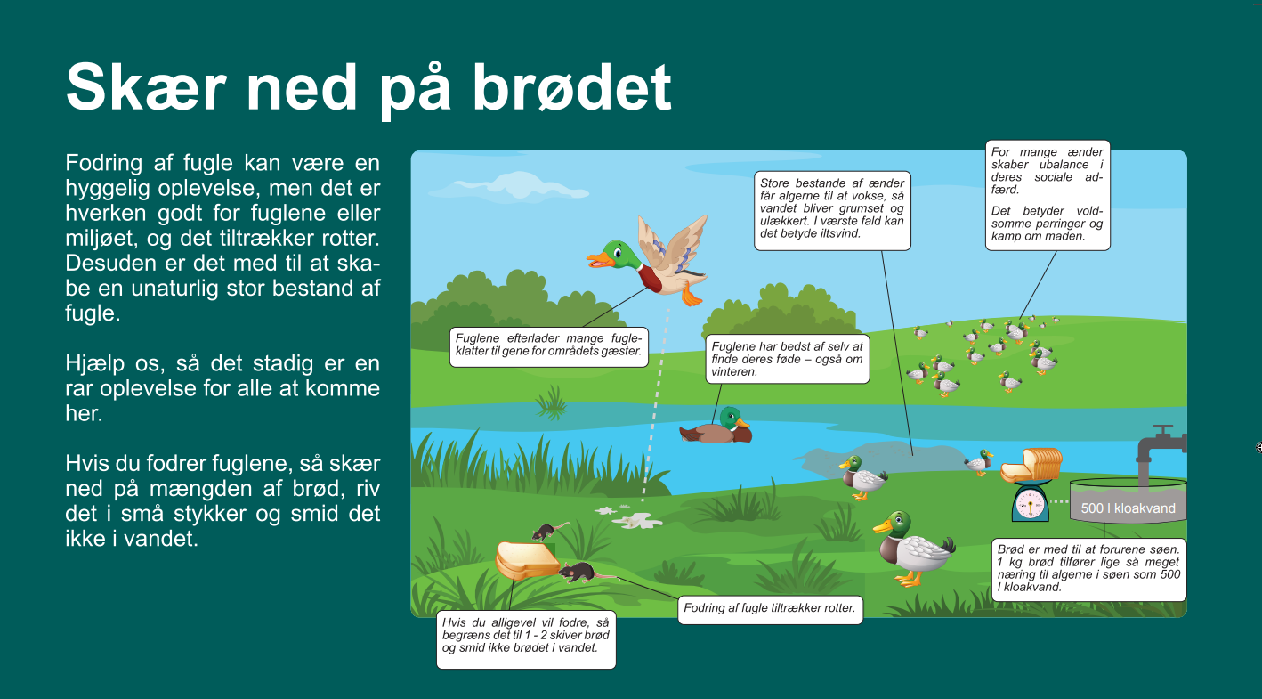 - ved legepladser og nær mindre børn kan have sundhedsmæssige konsekvenser, hvis børnene spiser det brød, der smides til fuglene.
