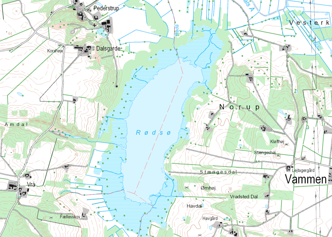 Rødsø ligger syd for Skals Ådal. Søen er privatejet.